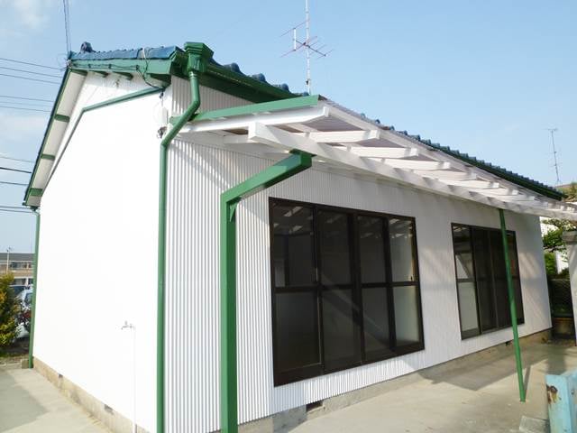 外壁塗装前の建物は年季が入り、どことなく古い感じが漂っている平屋の借家でしたが、建物を白く塗る事により、明るい雰囲気になったうえに、緑のアクセントが効いていて全体的に締まった感じとなりました。白×緑・・・「赤毛のアンの家」のカラーリングです。