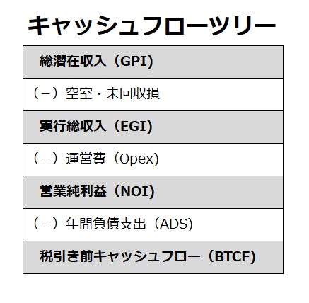 「NOI」から「年間返済額(ADS)」を差し引いたものが税引き前のキャッシュフロー(BTCF)です。